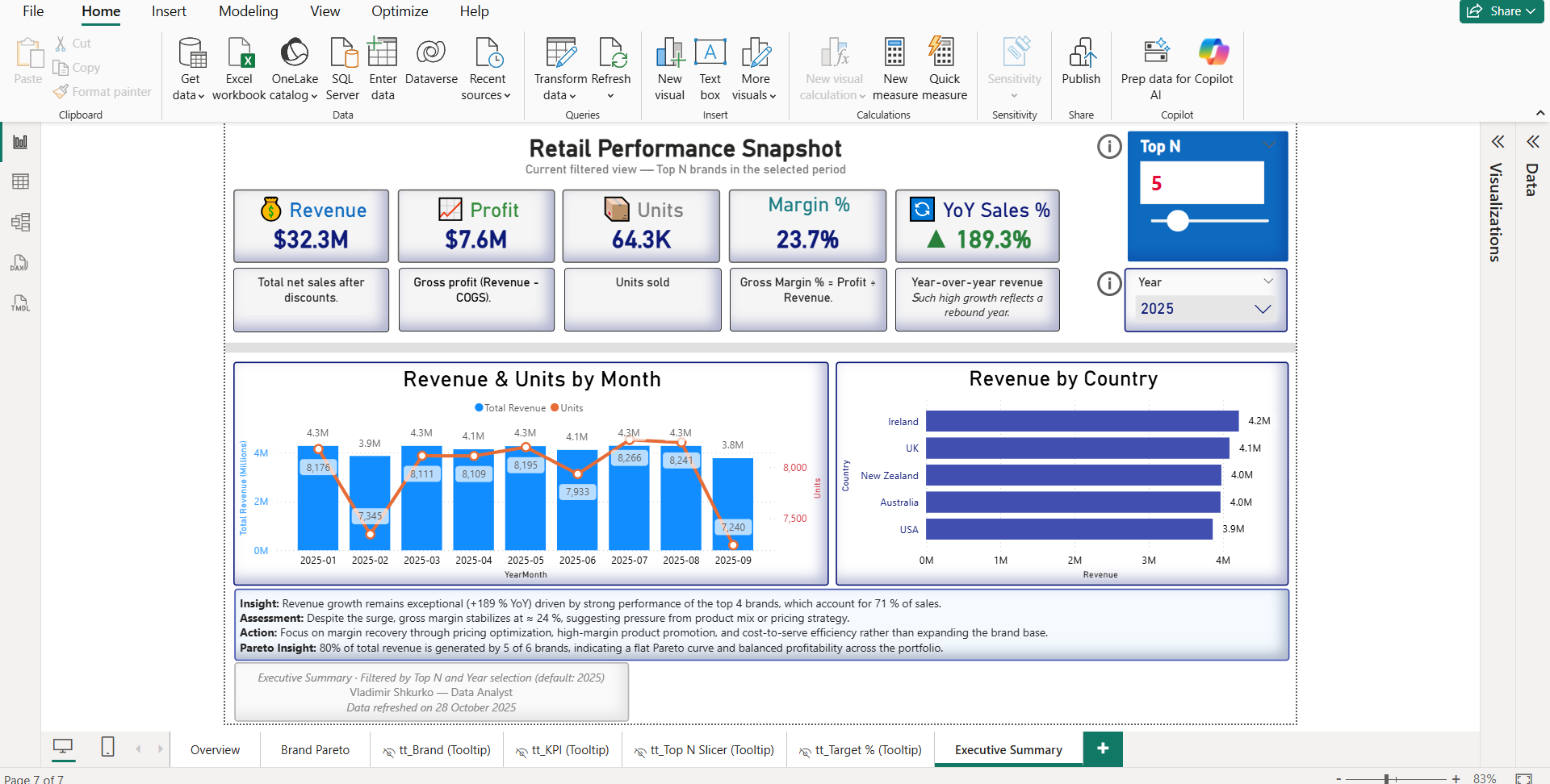 Executive dashboard with Sales, Profit, GM%, and YoY; drill-downs by Segment and Product; region split;